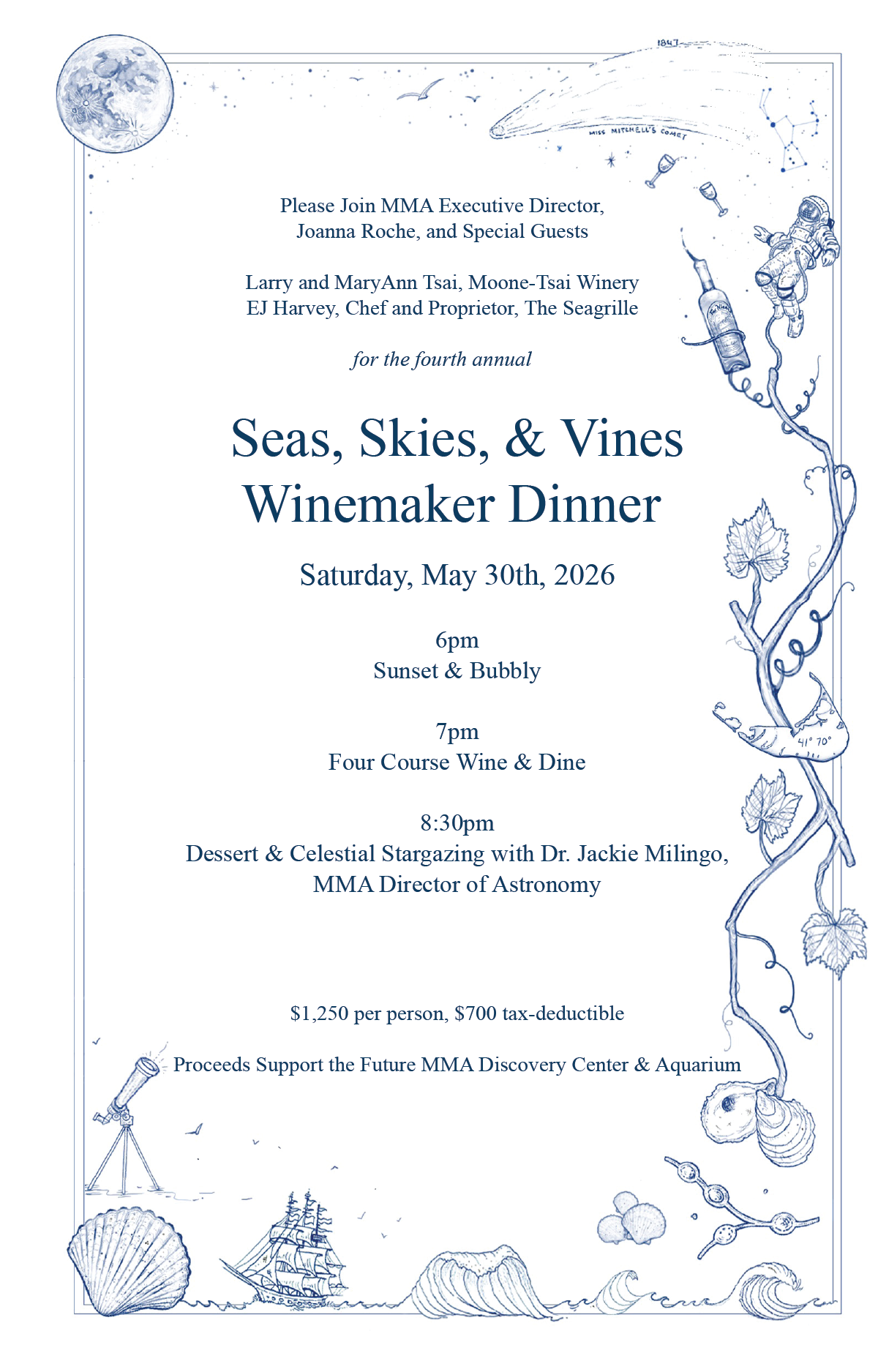 Please Join MMA Executive Director, Joanna Roche, with Special Guests, Larry and MaryAnn Tsai of Moone-Tsai Winery, and EJ Harvey, Proprietor of The Seagrille Nantucket, for an Evening of Sensational Wine, Food, and Celestial Wonder to Celebrate Our 4th Annual Seas, Skies, & Vines Winemaker Dinner